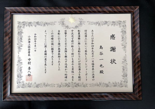 若狭湾沖で船の転覆事故があり救助をする機会が